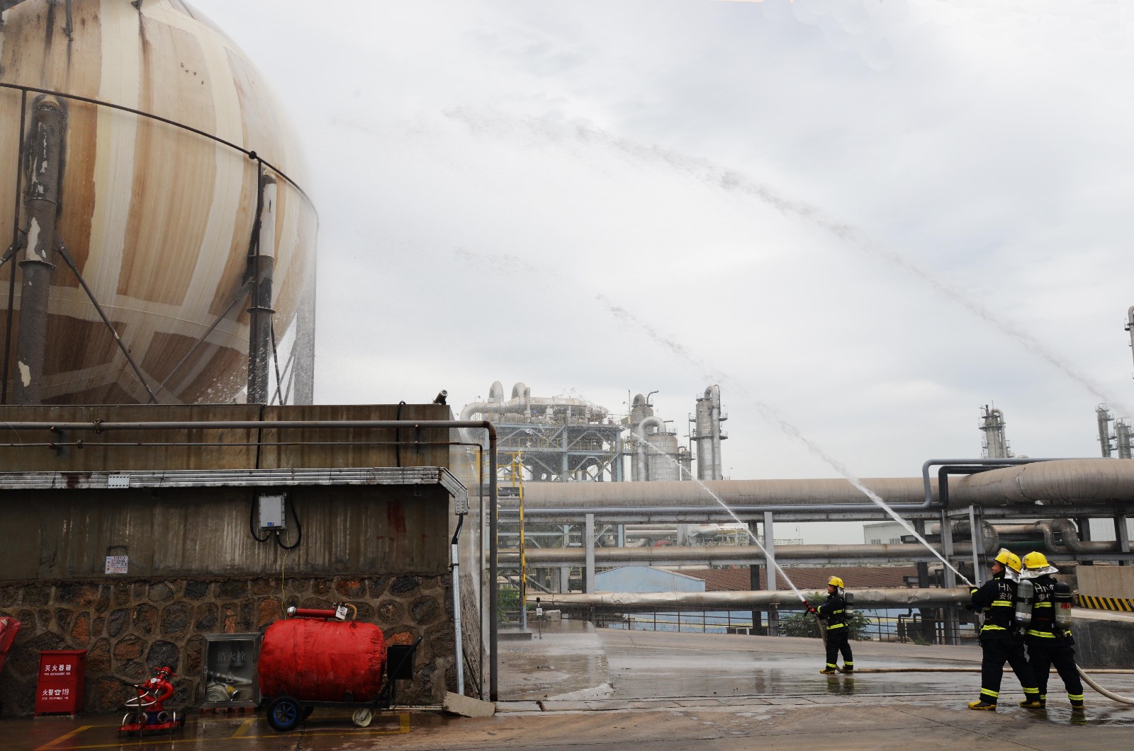 上午九點(diǎn),參演單位準(zhǔn)備就緒,總指揮徐愛軍宣布演練開始。隨即進(jìn)入演練場(chǎng)景,三甲胺罐區(qū)泄漏,濃煙四起,現(xiàn)場(chǎng)人員出現(xiàn)人員中毒,公司立即啟動(dòng)應(yīng)急預(yù)案,開展了現(xiàn)場(chǎng)人員自救、公司消防隊(duì)支援等多層次、多科目演練。